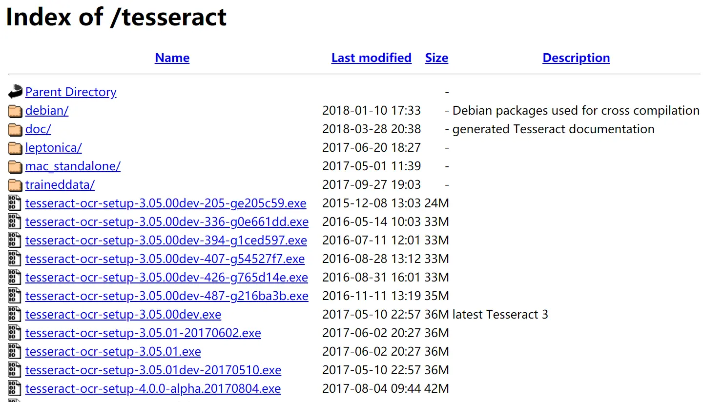 其中文件名中带有dev的为开发版本,不带dev则为稳定版本,例如jb是下载 tesseract-ocr-setup-3.05.01.exe;