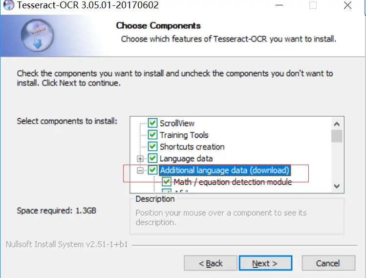 这里需要勾选红框里的Additional language data(download),这个选项是安装OCR识别支持的语言包,这样OCR就可以识别多国语言,然后再一路点击NEXT即可,因为要下载语言包,所以需要点时间,大概10-20分钟左右,跟网速有关,如果不需要支持多国语言的话,也可以不勾选,自由选择