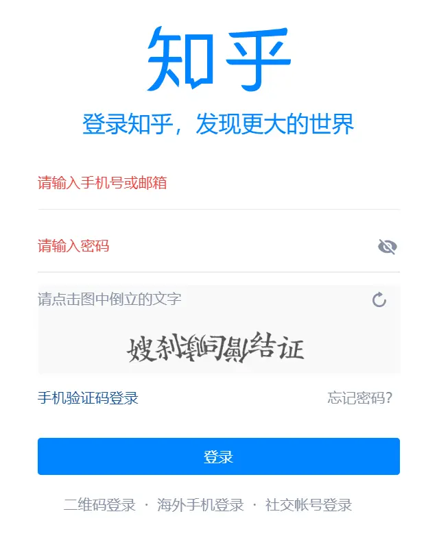 某乎的验证码有2种,一种是图形验证码,一种是点触验证码,经过测试发现,一开始是显示图形验证码,但当登陆退出次数逐渐增多,就会变成点触验证码,这种验证码的切换机制,也算是防爬虫的一种手段,闲话不多说,先喵喵: