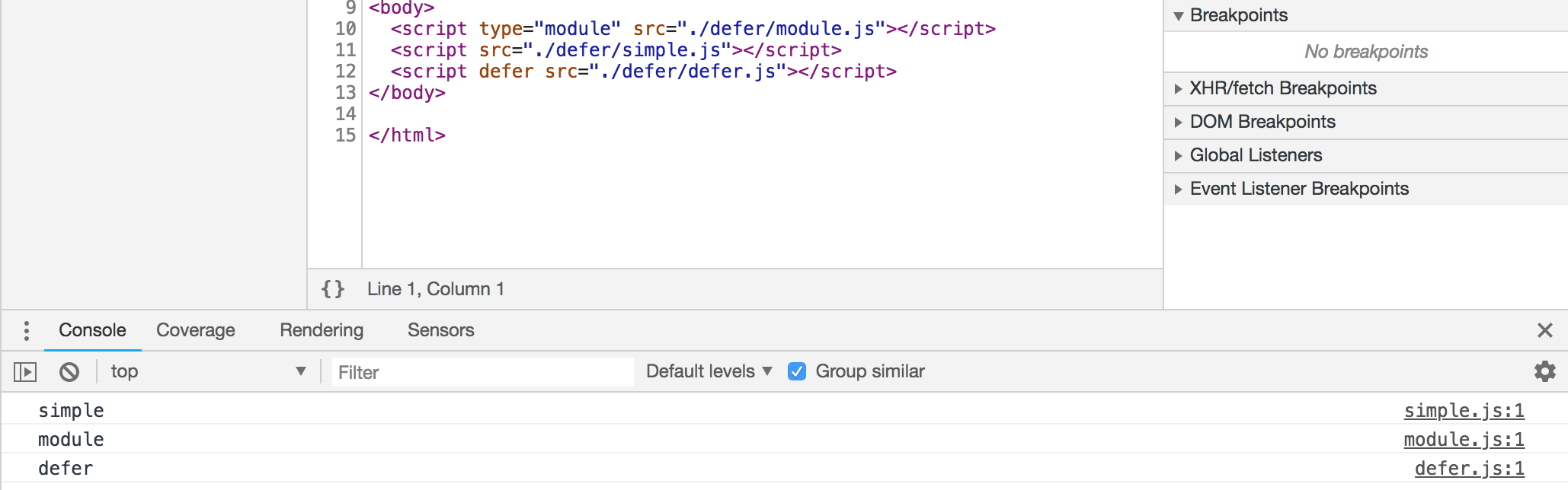 为了测试上边的观点,在页面中引入了这样三个JS文件,三个文件都会输出一个字符串,在Console面板上看到的顺序是这样的: