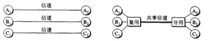 图中A1,B1,C1分别使用一个单独的信道和A2,B2,C2进行通信,总共使用三个信道,然而右图中使用一个复用器将三个信源的信号合在一起,通过一个信道传送,到接收端通过分用器将合在一块的信号分开传往对应的接受分端。复用器和分用器的成本不低,但是当输入端和接收端数量增大时,占用信道变多时,复用会是网络传输成本降低。