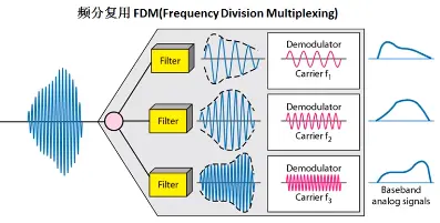 频分复用,顾名思义就是通过不同频率来实现复用技术,