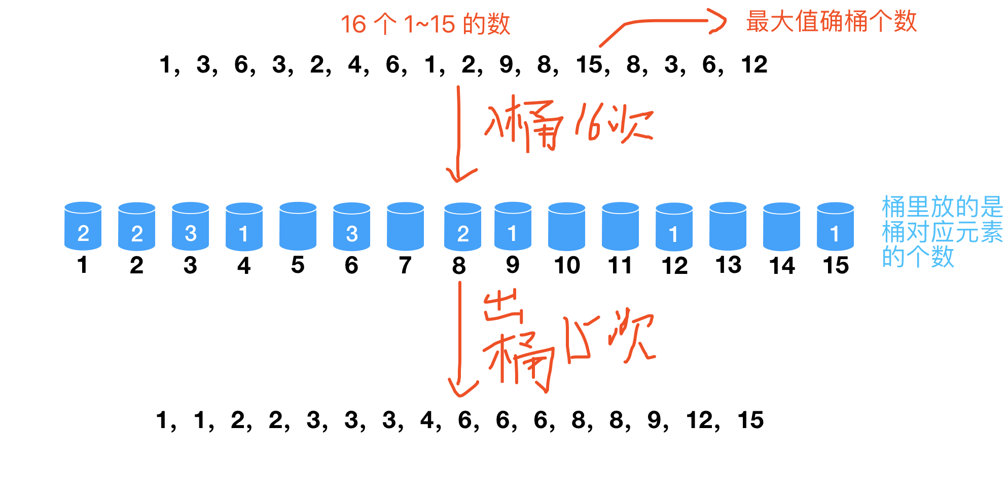 桶排序 (Bucket sort)或所谓的箱排序的原理是将数组分到有限数量的桶子里,然后对每个桶子再分别排序(有可能再使用别的排序算法或是以递归方式继续使用桶排序进行排序),最后将各个桶中的数据有序的合并起来。