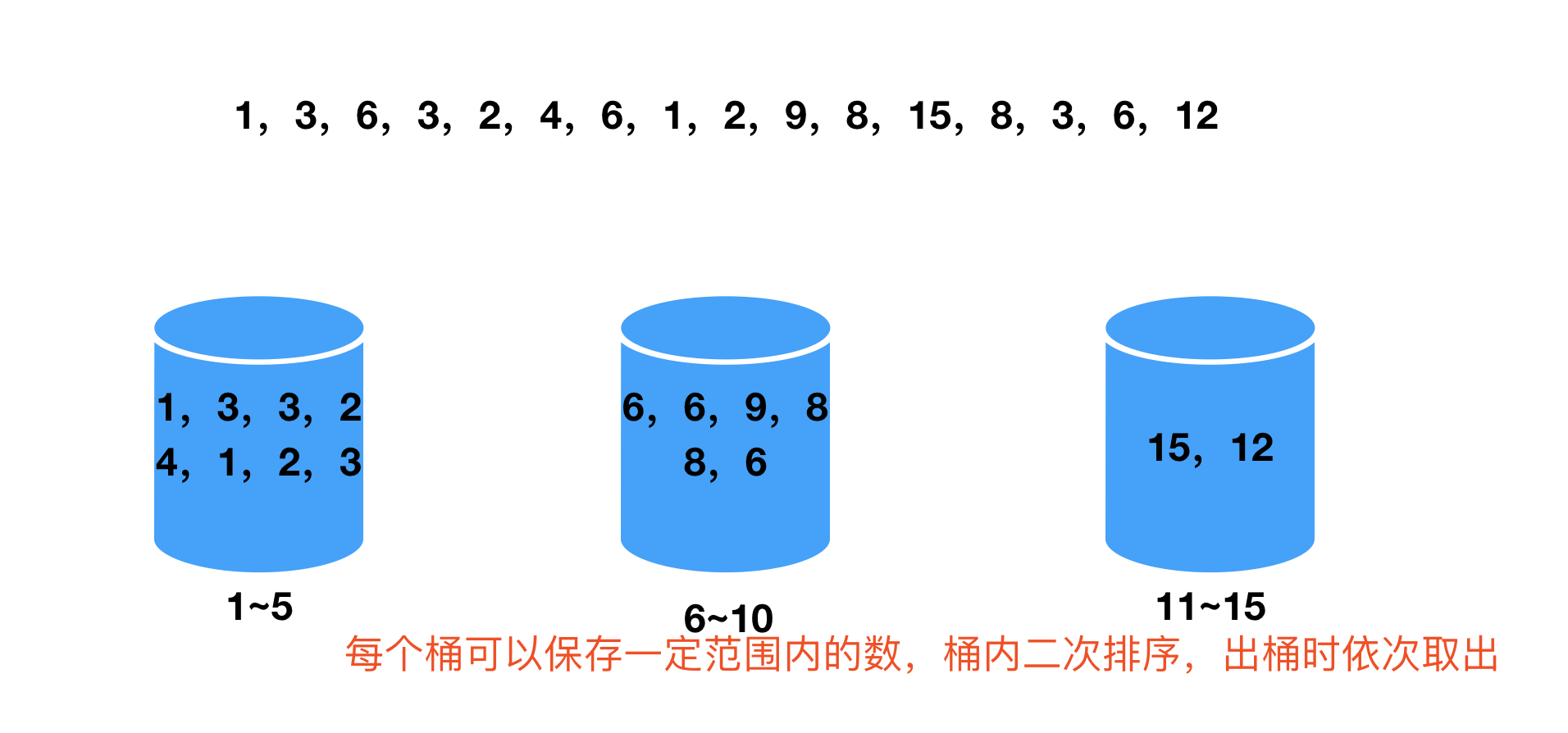 - 假设待排序的一组数统一的分布在一个范围中,并将这一范围划分成几个子范围,也就是桶