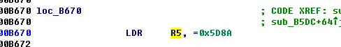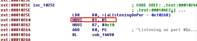 利用xrefs,找到printf的地方,看见是R5赋值给的R1