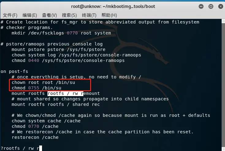 搜索这个文件的内容"mount rootfs rootfs / rw remount",在这一行之前添加