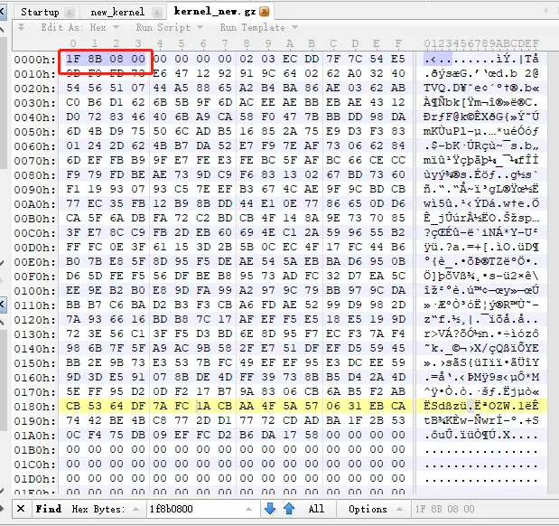 用010editor打开,ctrl+F搜索1f8b0800,然后把前面的都删掉(不包括1f8b0800,1f8b0800是gz的标志,同样的ramdisk也可以解开),另存为kernel_new.gz,原文件kernel之后还要用,不要覆盖掉