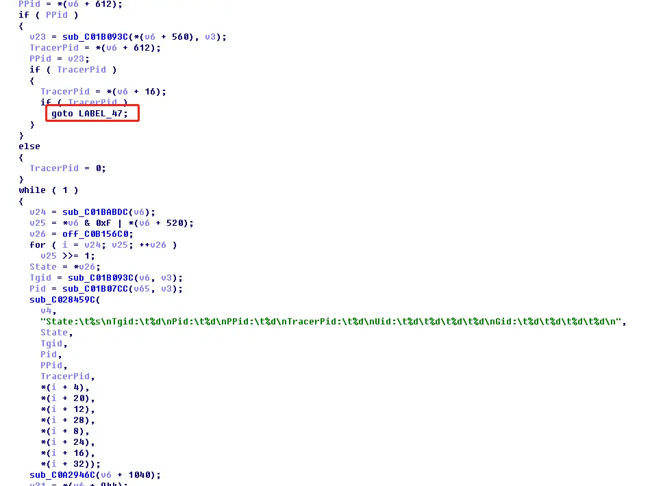 可以看到LABEL_47是TracerPid进行判断赋值的地方,我们要更改这里的代码,使其永远返回0