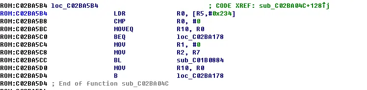 只要把MOVEQ R10,R0改成将0赋给R10MOV R10,#0(00 A0 A0 E3),BEQ loc_C02BA178判断改为直接跳转B loc_C02BA178(EC FE FF EA),