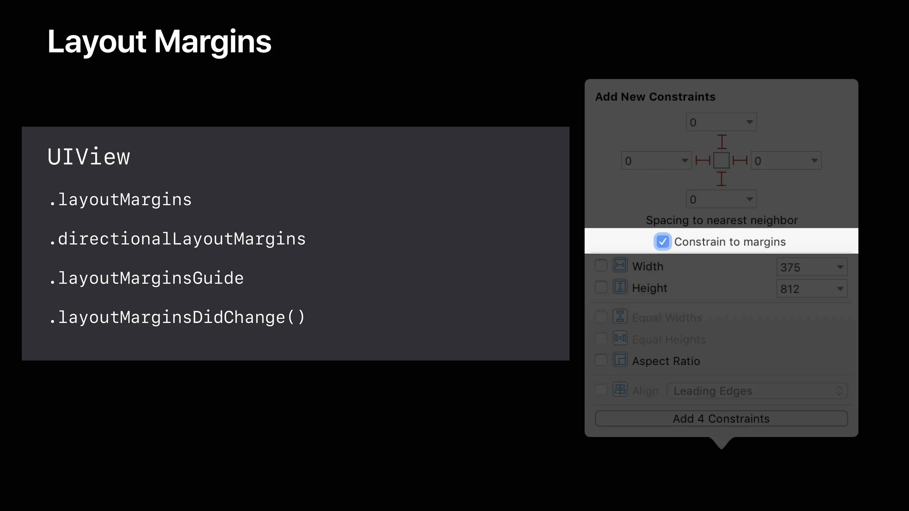 iOS8 中提出了 layoutMargins 的概念,其主要用于设置子视图与父视图之间的边距,在 iOS11 中新增了 directionalLayoutMargins,主要为了 Right To Left(RTL)语言下可以进行自动适配。默认情况下,layoutMargin 到各边的距离是8个点。通过在 Interface Builder 里面勾选 Constrain to margins 它会根据版本在 iOS11 及以上的系统中自动使用 directionalLayoutMargins,如 图5、6 所示。