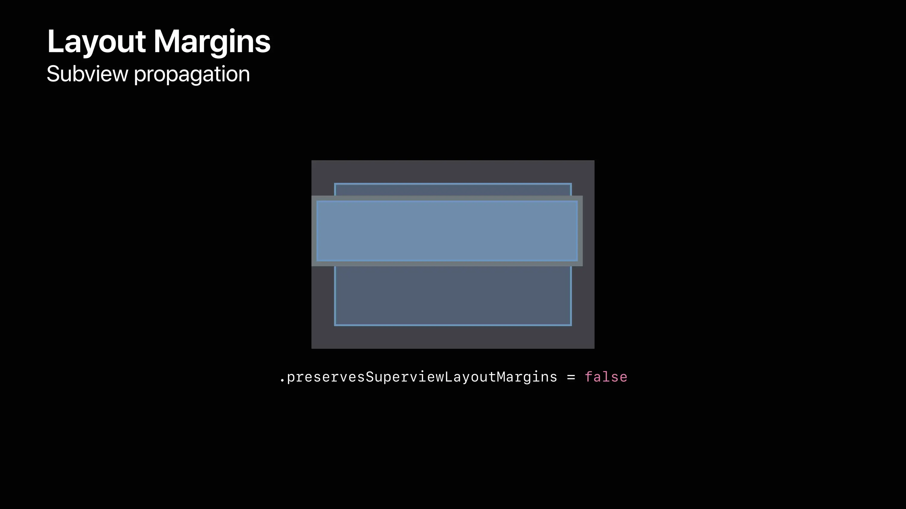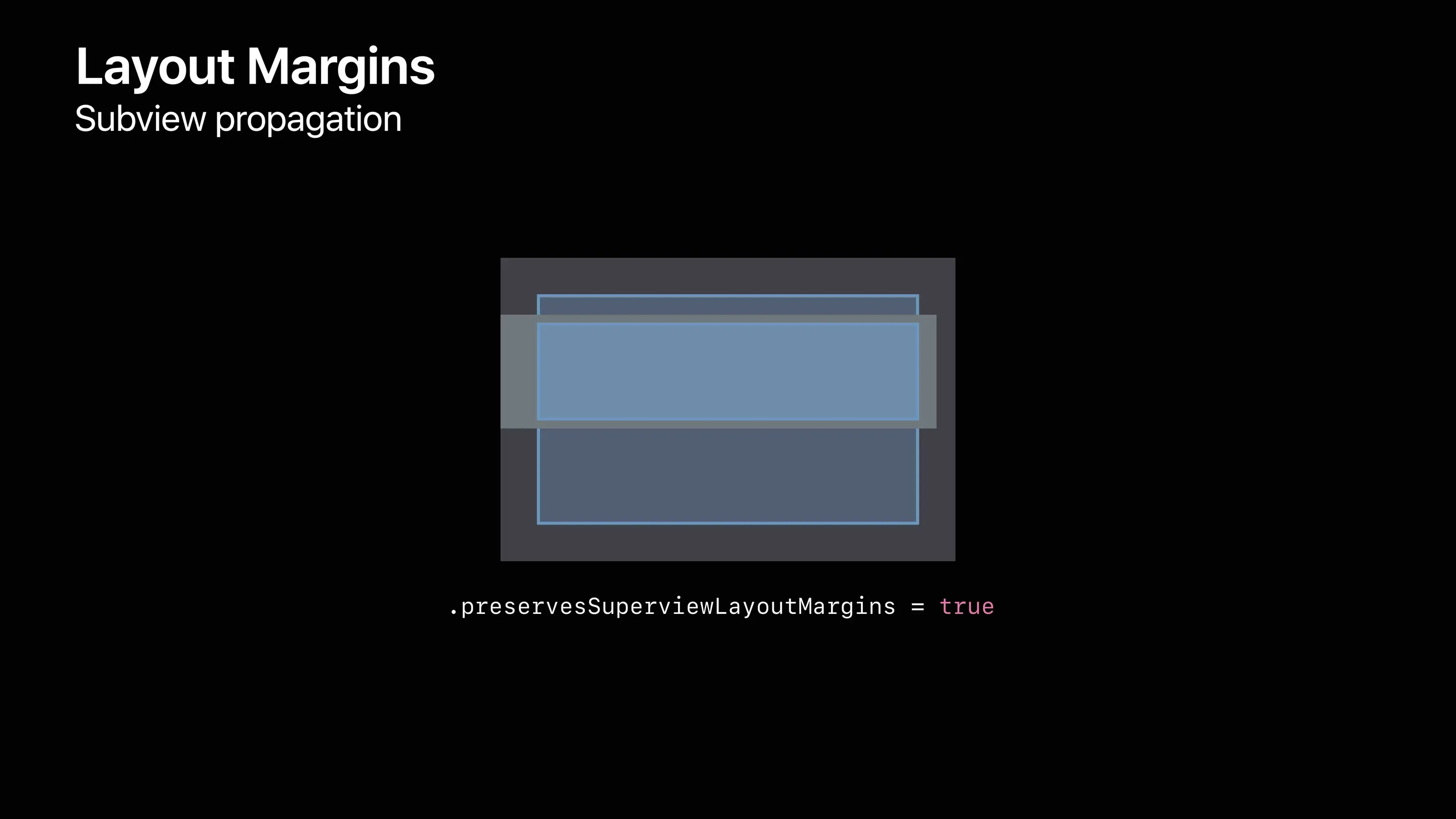 当一个视图的preservesSuperviewLayoutMargins属性为 true 时,在对它的子视图进行布局时,父视图的 margin 也会被考虑在内。如果存在一个子视图的 frame 刚好和父视图的 margin 表示区域有重合,此时设置 preservesSuperviewLayoutMargins 为 true ,则子视图会被刚好限制在父视图的 margin 内,如 图9、10 所示。
