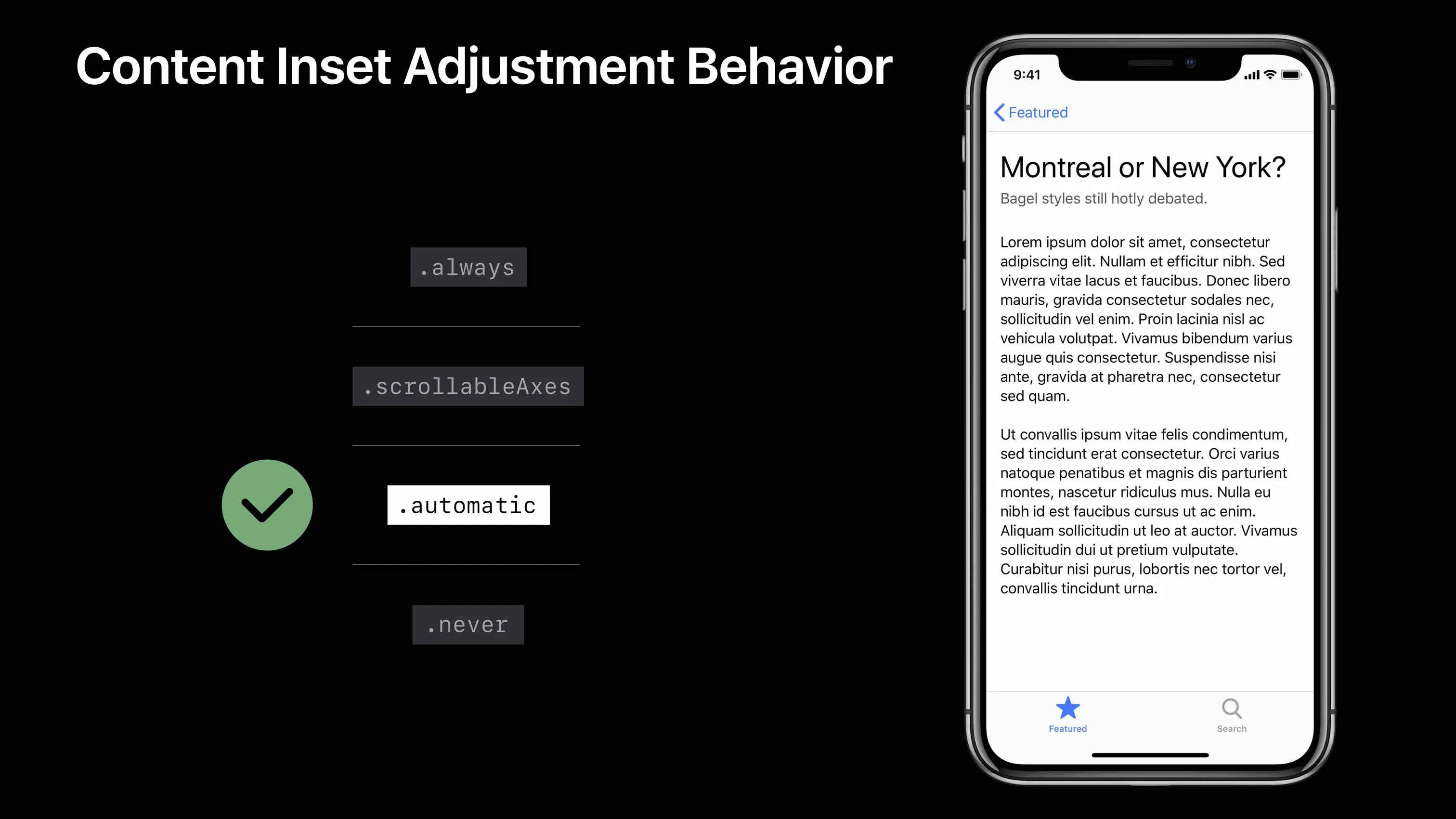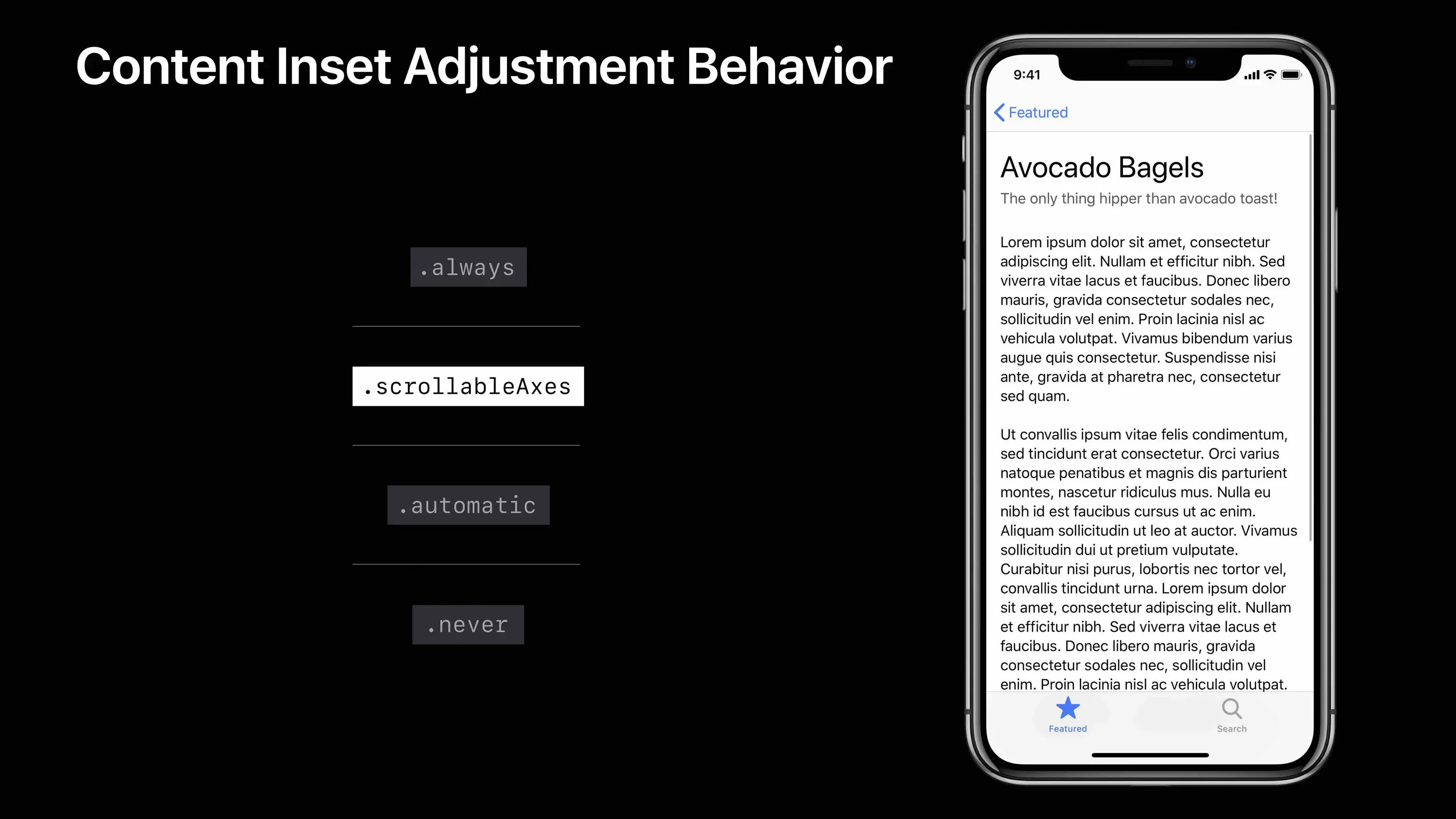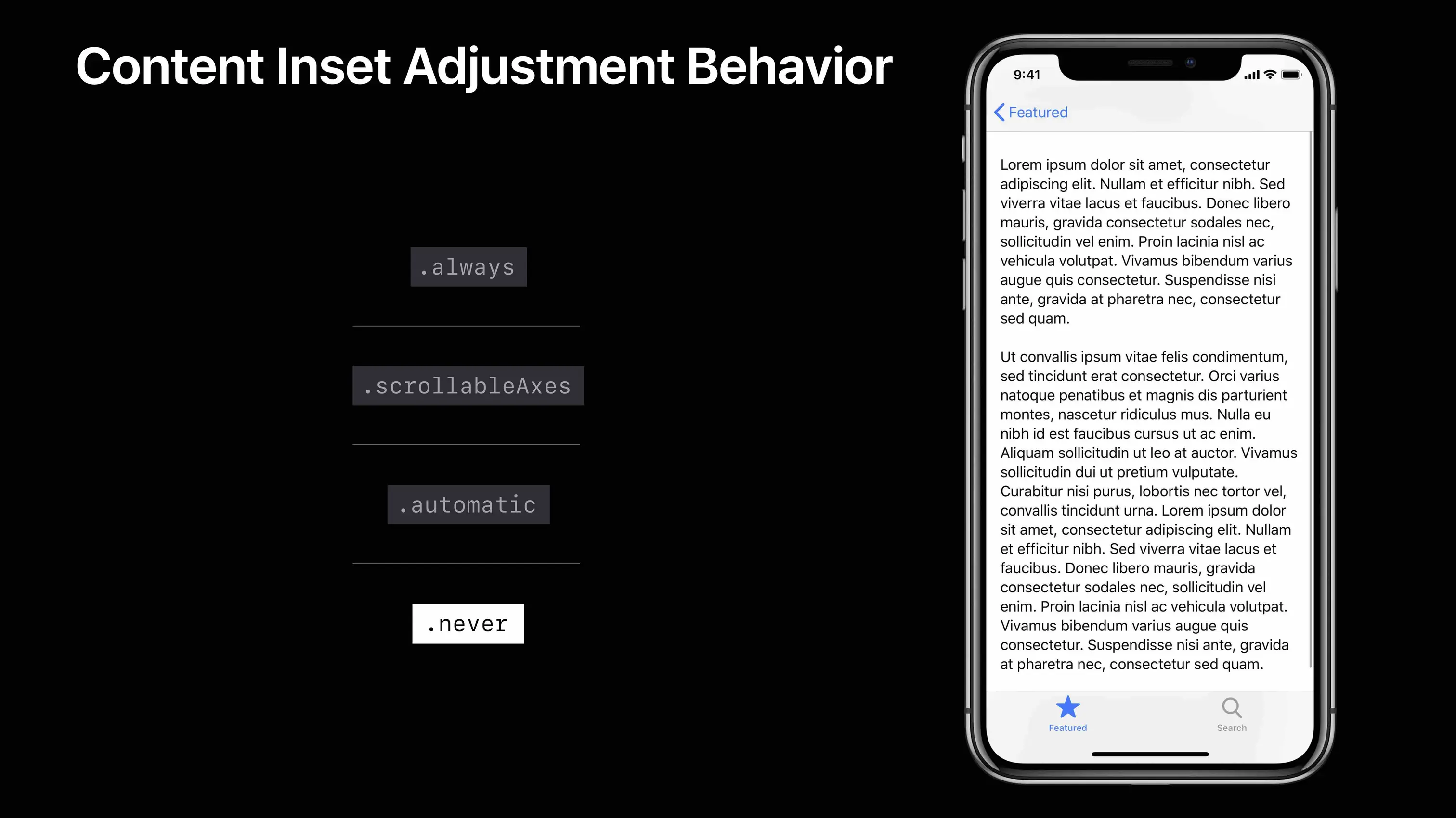 本 Session 再次提到 iOS11 之后废除了原有的 UIViewController 属性 automaticallyAdjustsScrollViewInsets 取而代之的是 UIScrollView 的新增枚举 ContentInsetAdjustmentBehavior,该枚举结构如下: