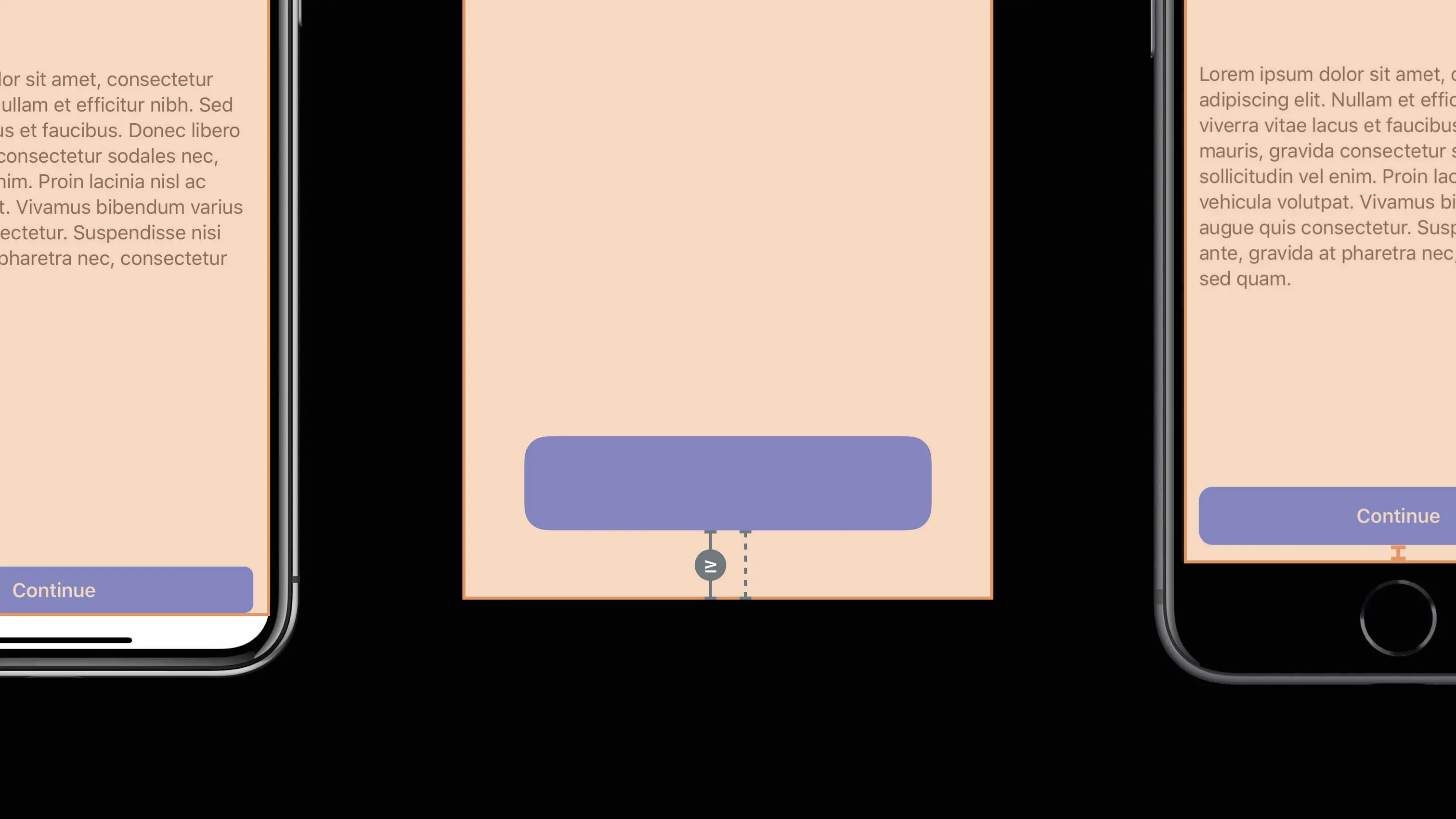 iPhone X 之后,我们在开发过程中经常会遇到如何布局底部按钮的问题。在本 Session 中官方给出了一种方案,例如设置按钮距底部相对于 superView 的约束为16,约束的 Priority 为 999,同时设置按钮底部相对于 safeAreaLayoutGuide 的约束值为大于等于 0。即可实现按钮在 iphone X 和 其他设备上的不同布局,如 图23 所示。