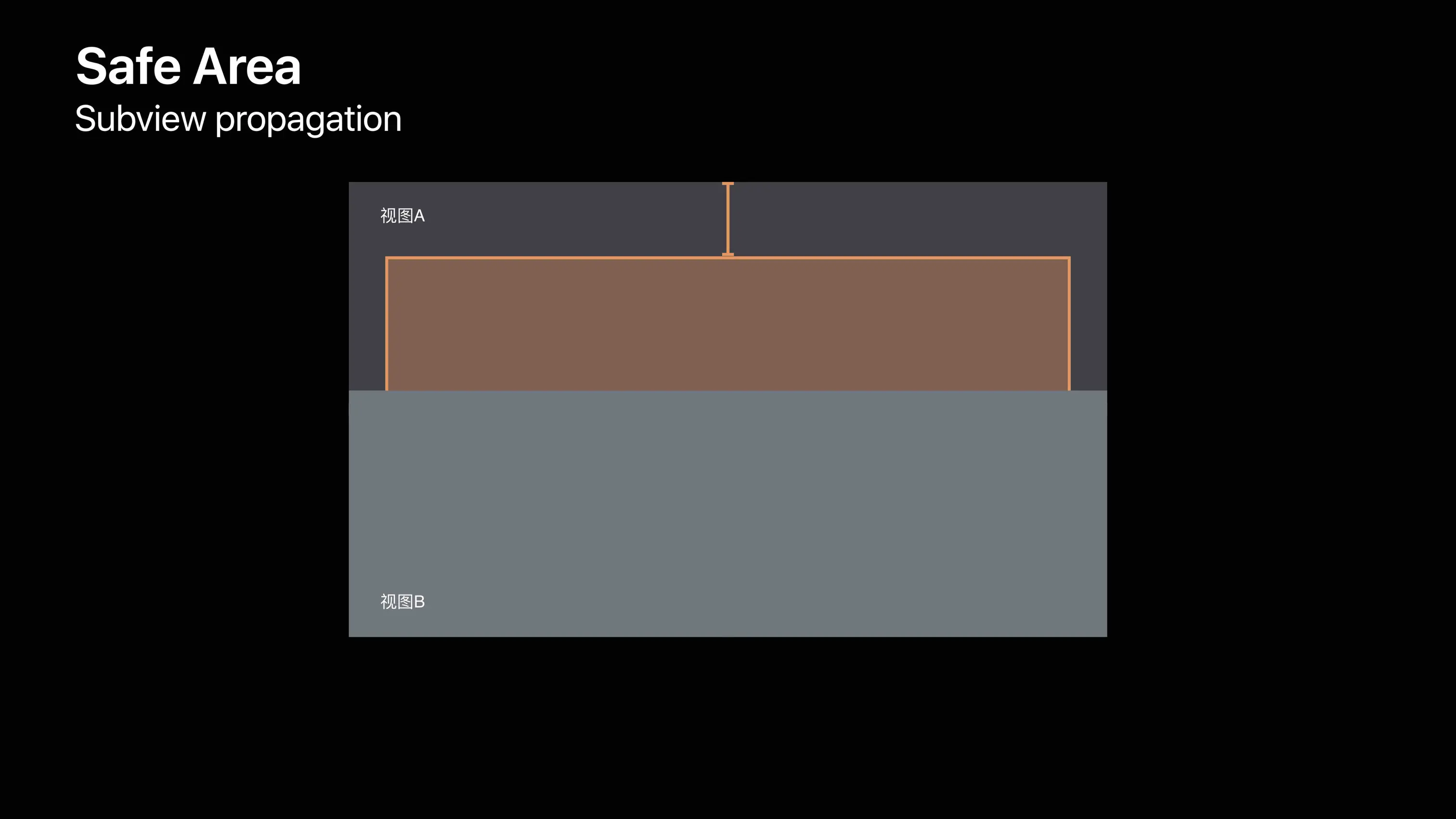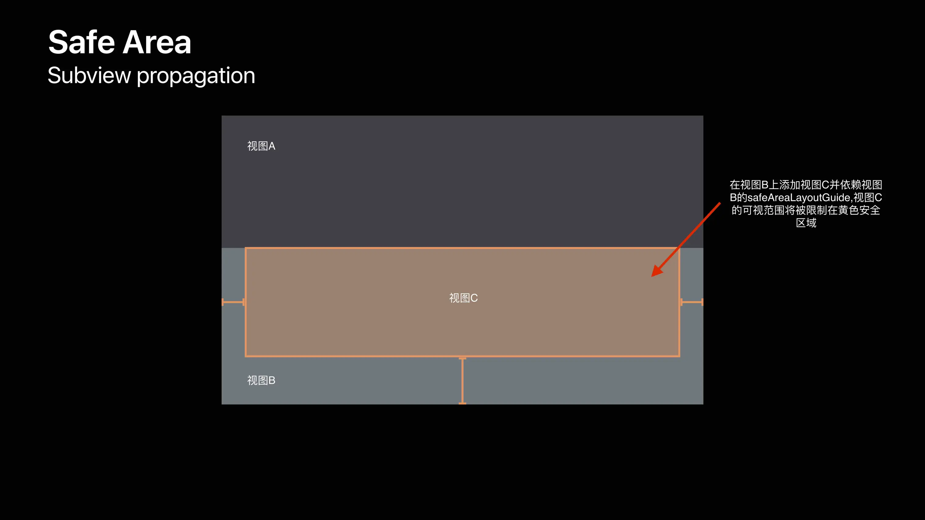 通过下面两张图我们可以知道,最底部视图A的安全区域如 图2 所示,随后在上添加一个不受限于视图A安全区域的浅灰色视图B,然后在视图B上添加子视图C,并设置视图C的约束依赖于视图B的 safeAreaLayoutGuide,视图C的可视范围会被限制在 图3 黄色区域,我们可以得出父视图的安全区域会向上传递,如 图2、3 所示。