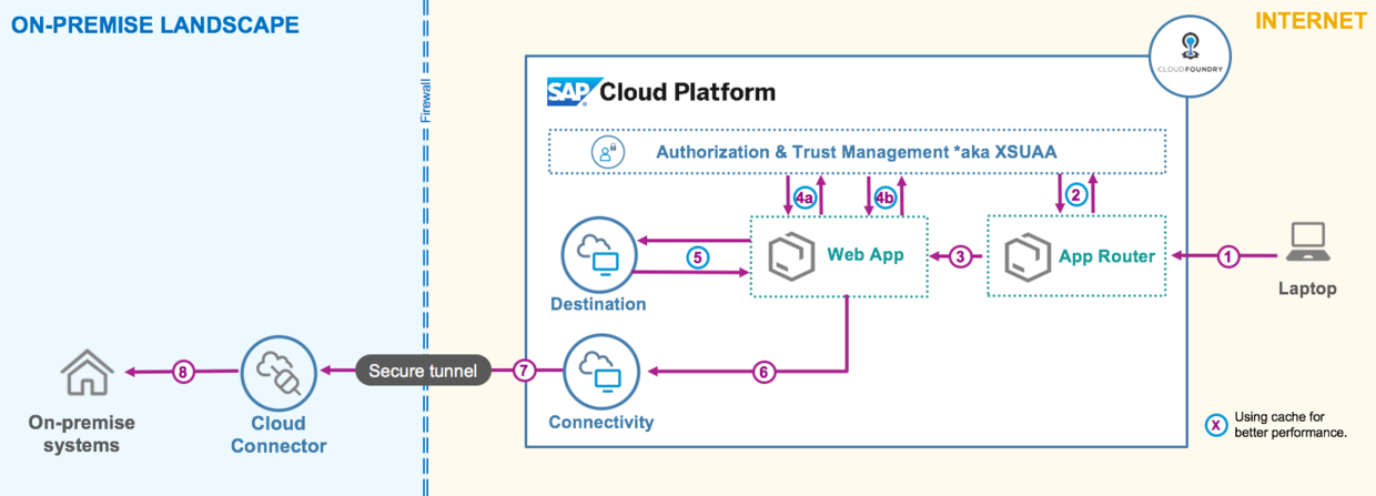 上图1~8的图例描述了部署在SAP云平台CloudFoundry环境上的Web应用是如何通过Cloud Connector访问On-Premise系统上的服务。