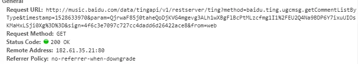 # http://music.baidu.com/data/tingapi/v1/restserver/ting?method=baidu.ting.ugcmsg.getCommentListByType×tamp=1528636009¶m=NT6J1C5axIckxMHUH2k3Ph1pDNp7wWl6s0IoSsSQMcRi1YJKw0RdAfhQ0ULfOwjRNvoopUj6Ki6jMzXwBLatcQ%3D%3D&sign=c16dd43318fc66aa6b2865b7ce25541b&from=web