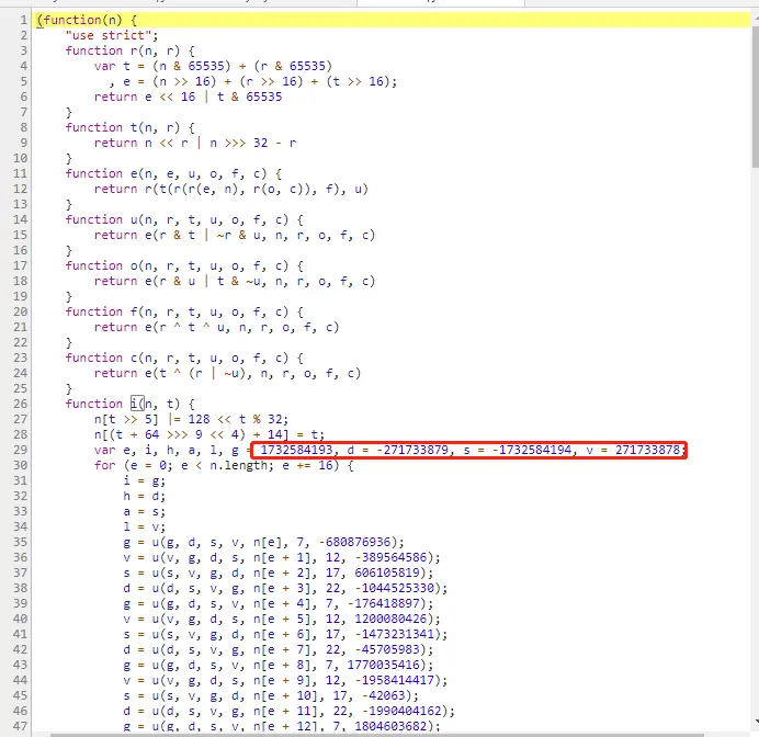 熟悉的配方,熟悉的味道,看起来就是MD5,在函数末尾下个断点(点击前面的行号就可以下断点),换页即可运行,F10一直单步运行,发现最后会跳转到另一个js