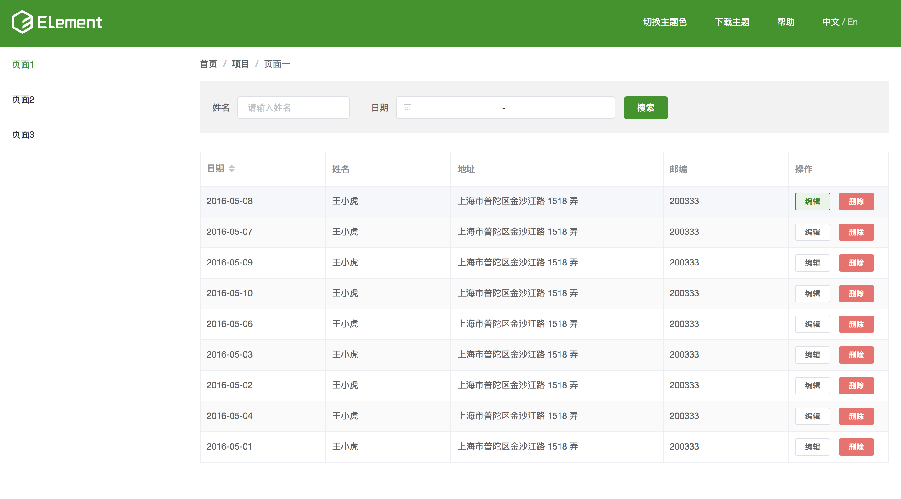 我们可以使用官网推荐的在线主题生成工具,点击右上方的切换主题色,选取自定义的主题色,作者在这使用的是#129611,可以看到效果: