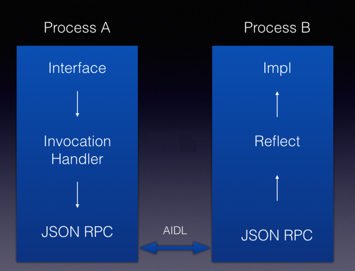 恰好最近一年都是在做后端工作,想到了Json RPC的方案,其实Android跨进程接也是一种rpc调用方式,那么参考json rpc协议,通过aidl通道也可以很简单一种跨进程通信方式,而且使用方式也很简单。