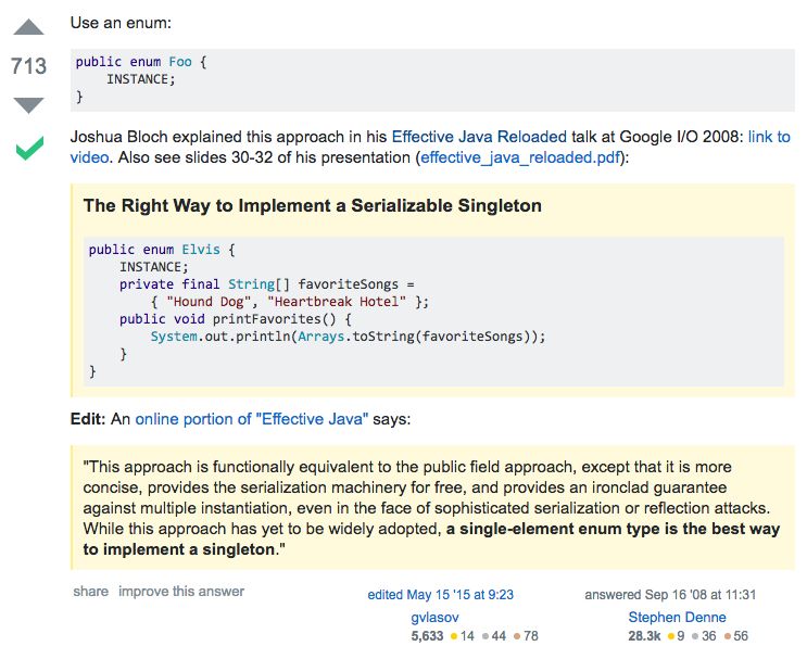 public enum Singleton { INSTANCE; public void whateverMethod() { } }