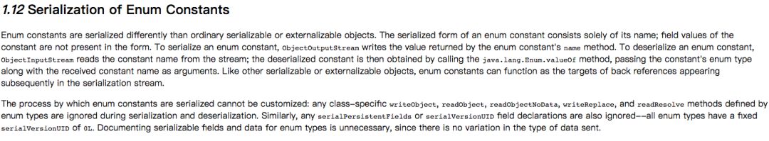 那么,对于序列化这件事情,为什么枚举又有先天的优势了呢?答案可以在Java Object Serialization Specification 中找到答案。其中专门对枚举的序列化做了如下规定: