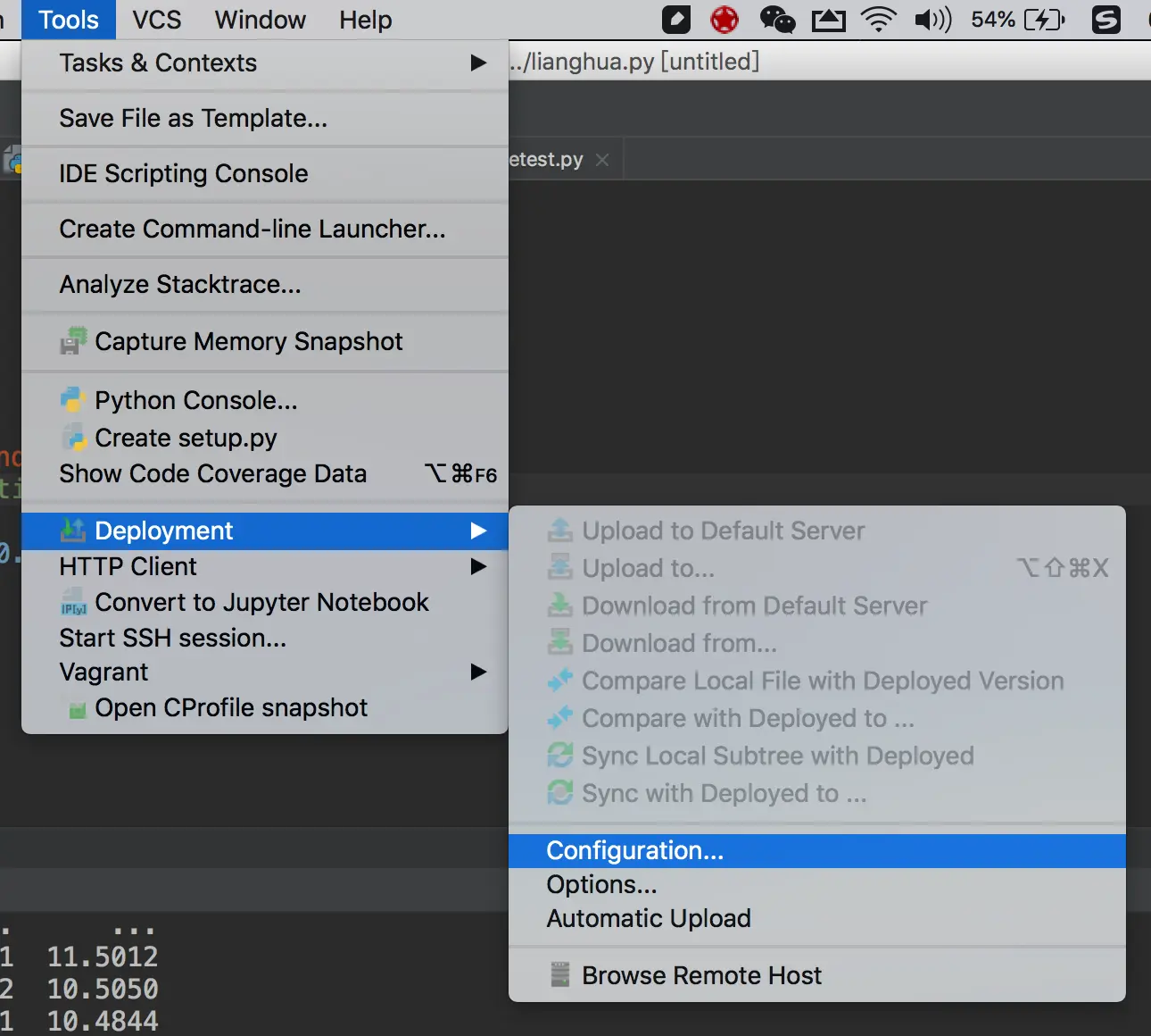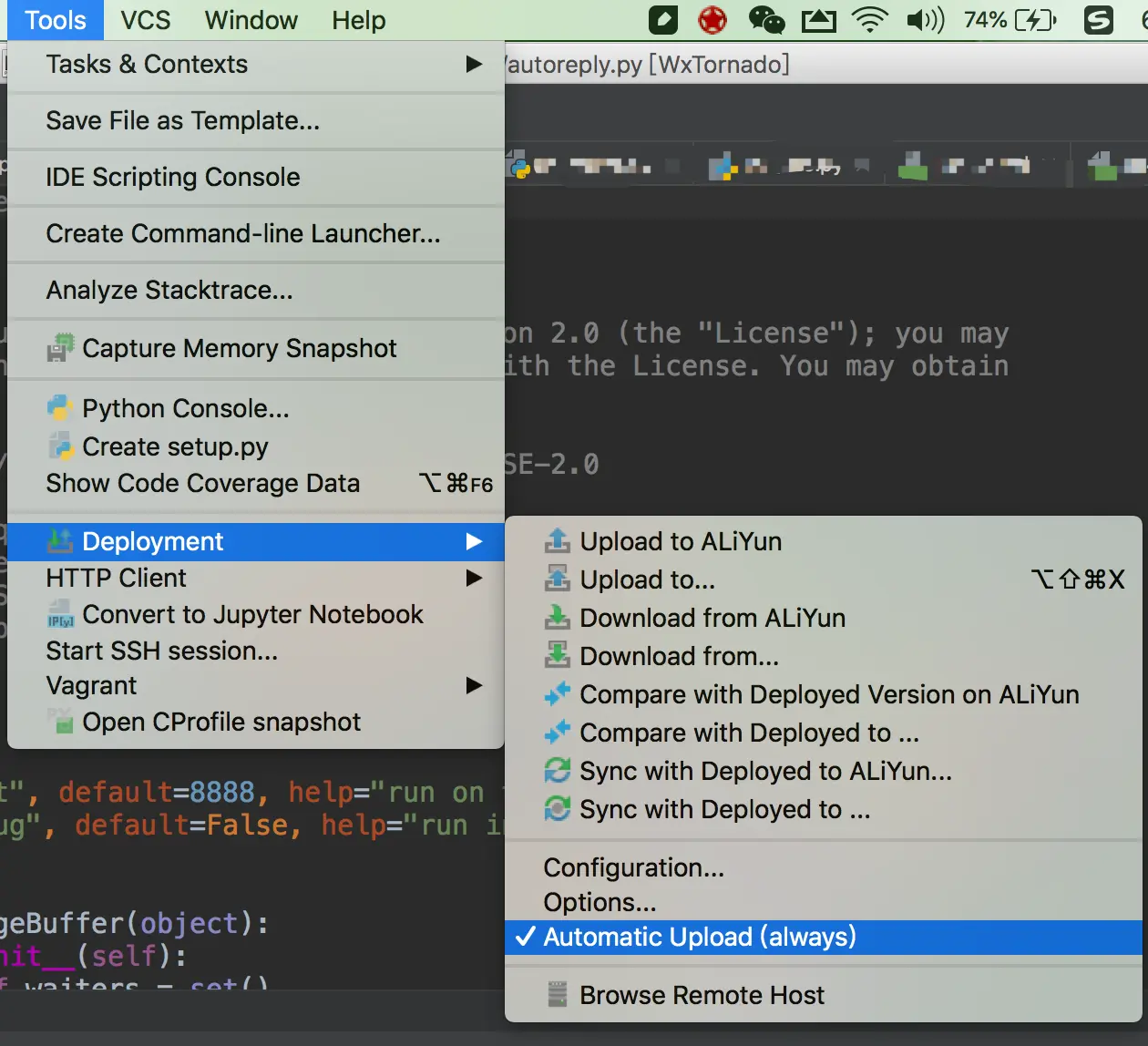 然后点击OK。接着,在Tools -> Deployment -> Automatic Upload点击打钩,这样每次编写完一个文件,代码就可以自动同步到服务器上了。