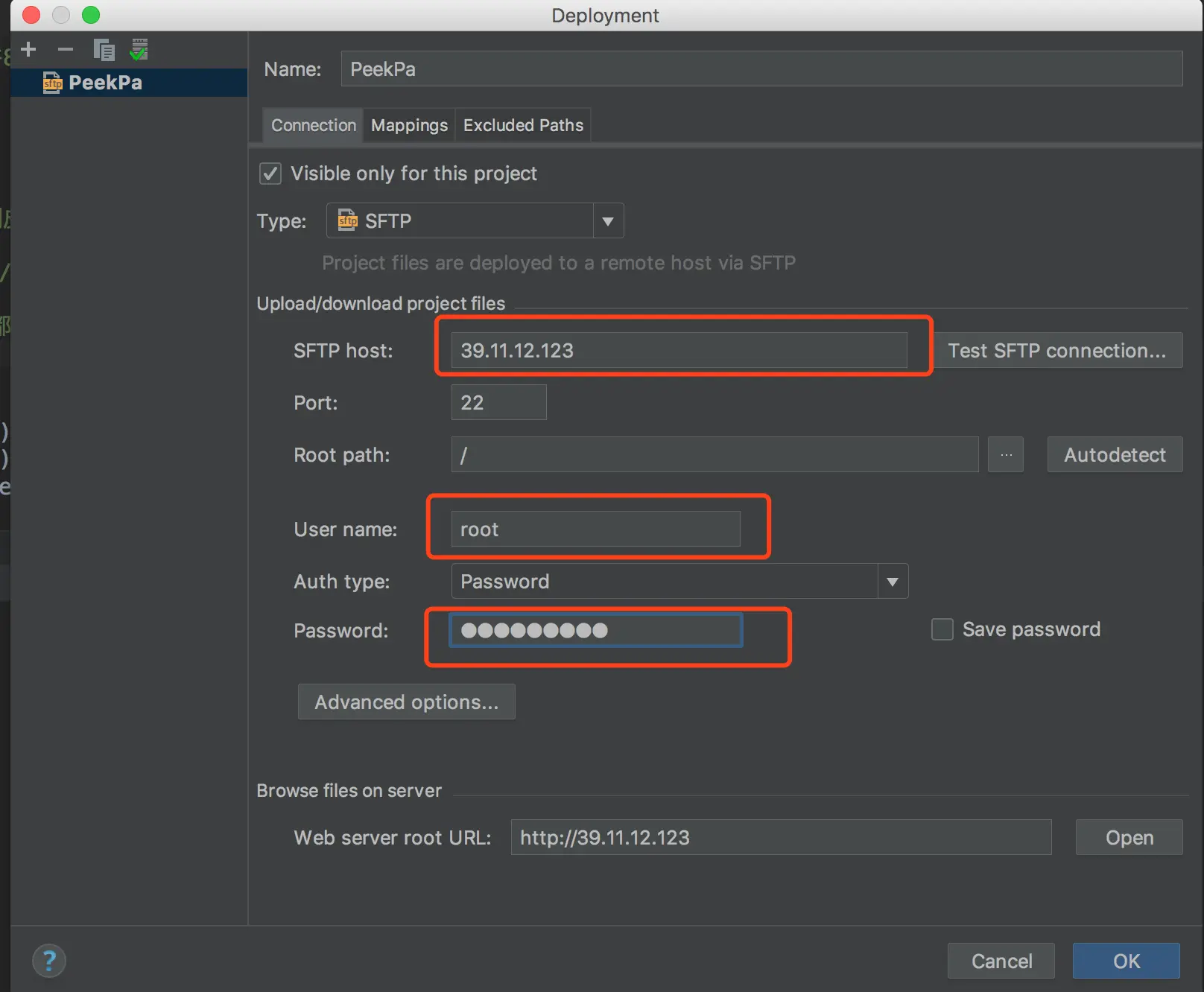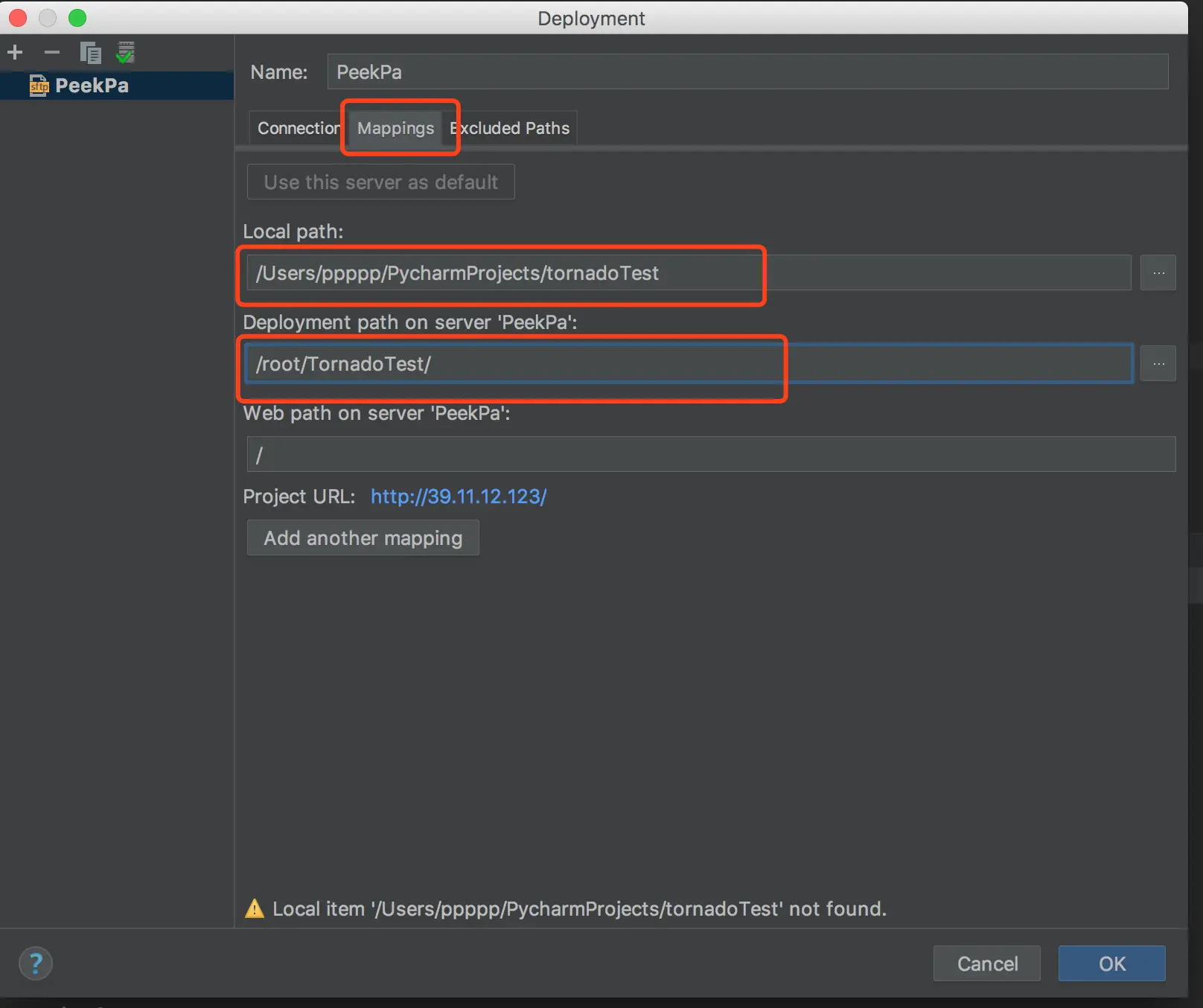 接着第二页,Mapping里面,第二个红框里面,填写你本机的工程目录地址,第三个红框填写在服务器上的工程目录地址(提前建好)。