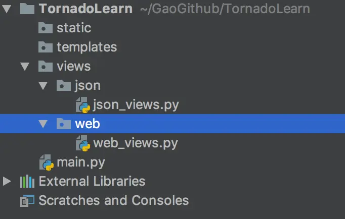 遵循我们上面所说的,定义url路径,然后写Handler。所以,我就先按照这个思路,把工程目录按照这个样子建立了一下: