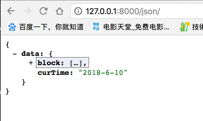 我们要在JsonHandler中,实现get()方法。这里,我们首先从数据库中读取出来数据,然后,得将数据转换成dict()格式,因为PyMongo读取出来的数据,不能够直接转成Json,因为里面有个叫Object_id的东西,所以,这里我们就手动转一下。然后,把数据用self.write(json.dumps({"data": {"block": return_data, "curTime": cur_time}}))的形式返回回去就好。结构相当简单,大致代码如下: