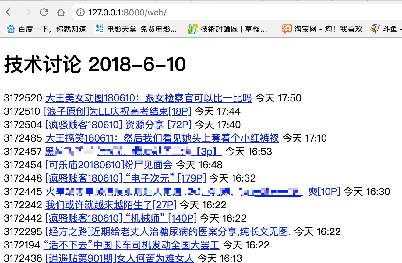 Web返回结果,我们这里就用到了html的东西。首先,我们得在template里面建一个index.html文件。然后,在WebHandler中,最后返回结果写成:self.render("index.html", info=posts, today=cur_time)这样就可以了。这里简单说一下,第一个参数,是你template里面对应的html文件。第二个参数和第三个参数,是你需要传给前端的数据。名字随便叫,但是要和html里面保持一致。