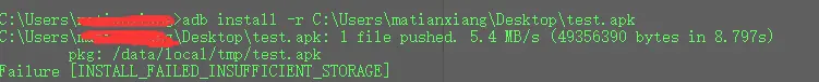 事件背景,在一次测试的时候,自己反复安装卸载同一个应用是,有时会安装失败并返回INSTALL_FAILED_INSUFFICIENT_STORAGE,如下图: