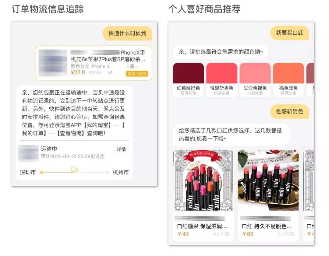 阿里小蜜中的物流进度查询(左)、基于个人喜好的商品推荐(右)。