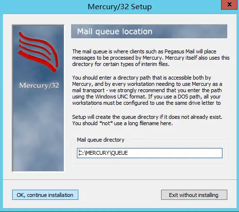 10.设置发信队列存储目录,默认在C:\MERCURY\QUEUE,请点击 OK, continue installation