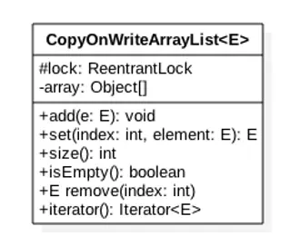 如上,CopyOnWriteArrayList的类图,每个CopyOnWriteArrayList对象里面有一个array数组对象用来存放具体元素,ReentrantLock独占锁对象用来保证同时只有一个线程对array进行修改,这里只要记得ReentrantLock是独占锁,同时只有一个线程可以获取就可以了。