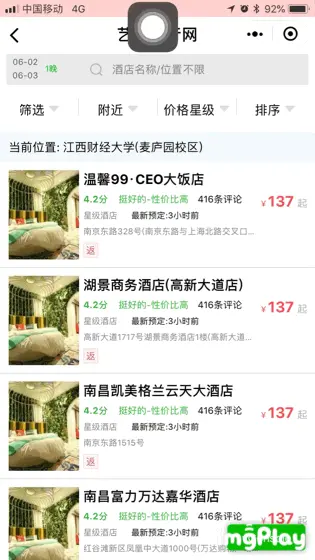 首先在input框上面绑定bindinput事件获取输入值,然后利用地图APIgetSuggestion()方法获得提示的值,再将值进行筛选判断数据的category属性是否为宾馆酒店,如果是则用一个新数组存放酒店列表值(没有酒店信息的API,暂时只想到这个拙略的方法,所以酒店图片都是相同的),最后将获得的酒店信息驱动到酒店列表界面。