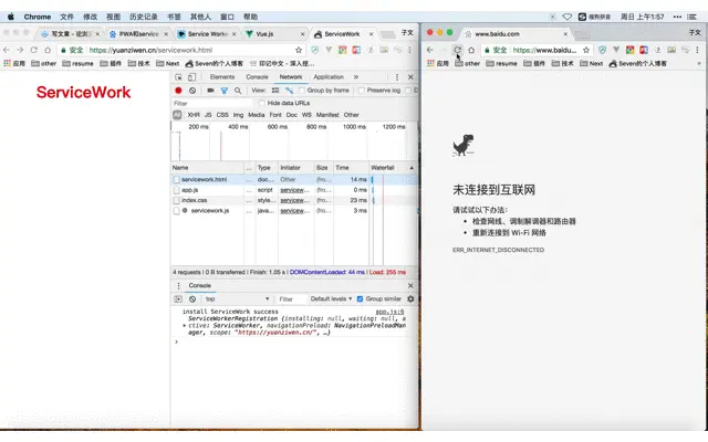 啊哈,漂亮!这样就实现了离线访问,但是在实际项目中,尽量不要缓存servicework.js文件,可能无法及时生效,进行后续修改。我们去控制台看下