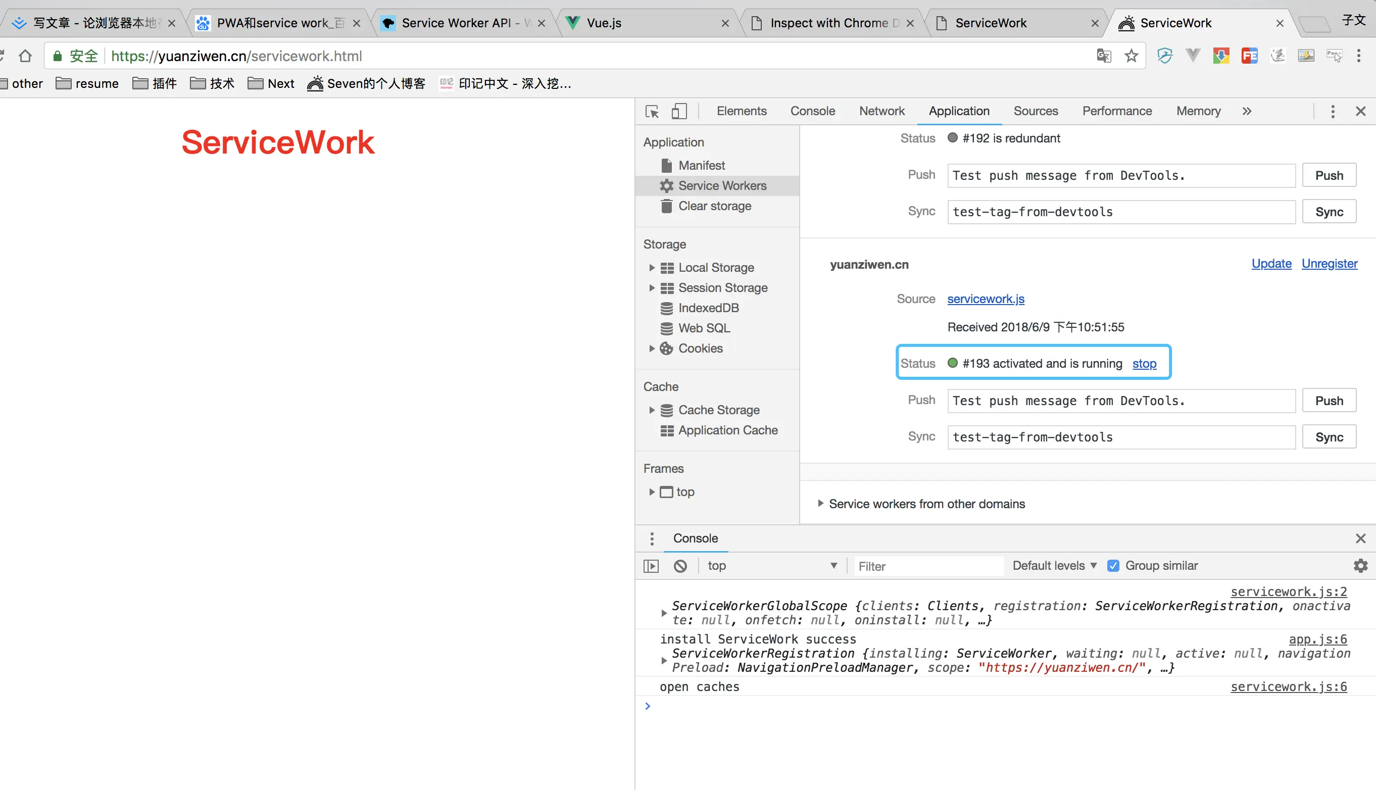 terminated后,新的 ServiceWork 才会发生作用。具体行为就是,该网页被关闭一段时间,或者手动的清除service worker。然后,新的 Service Work 就度过可waiting的状态。 - 一旦新的 Service Work 接管,则会触发