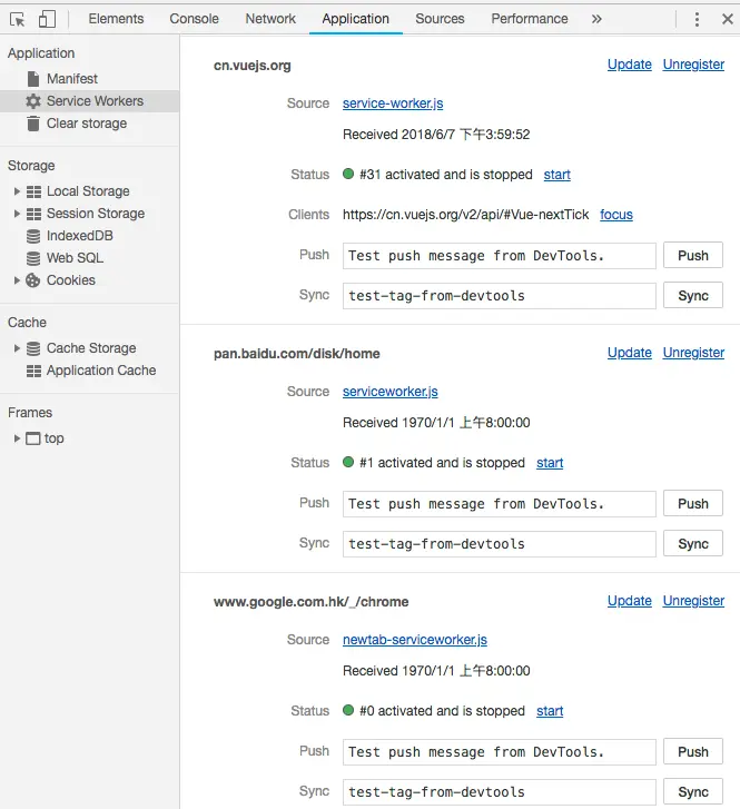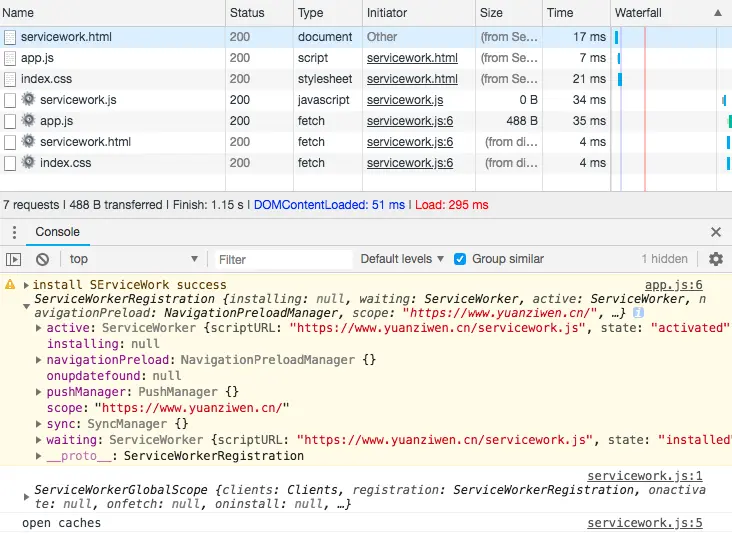 });另外,如果你一旦用到了 ServiceWork.js 并且确定路由之后,请千万不要在更改路径了,因为,浏览器判断 ServiceWork.js 是否更新,是根据 ServiceWork.js 的路径来的。如果你修改的 ServiceWork.js 路径,而以前的 ServiceWork.js 还在作用,那么你新的 ServiceWork 永远无法工作。除非你手动启用 update 进行更新。