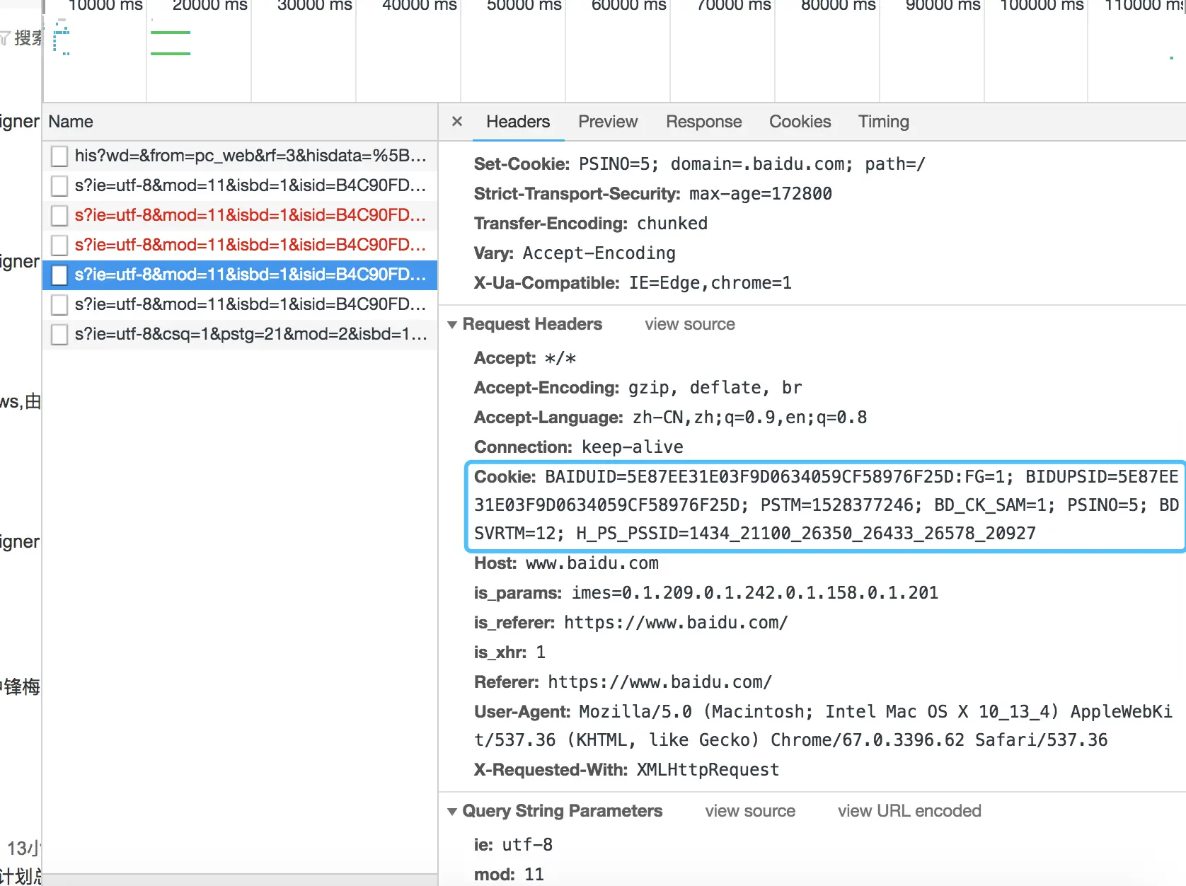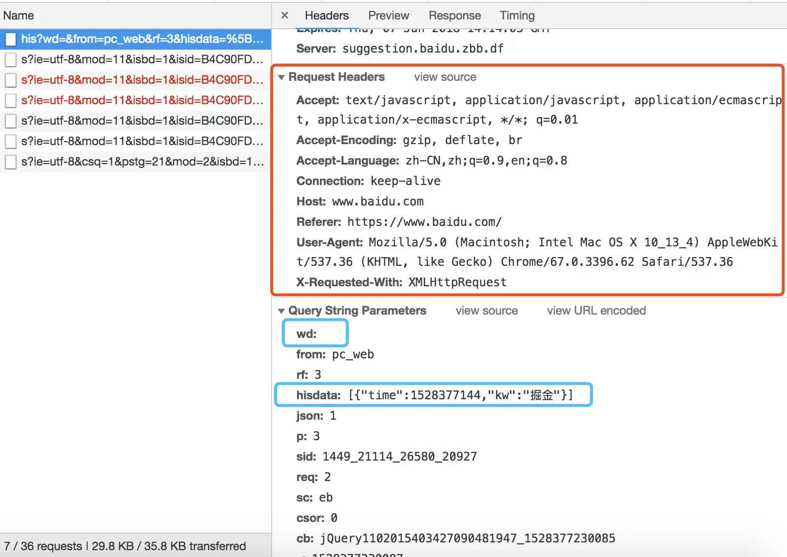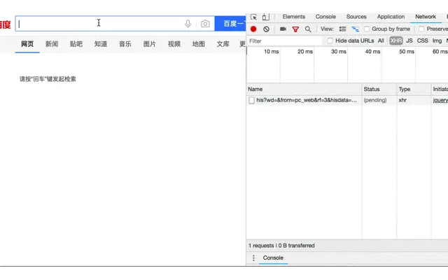 第一次触发的是focus(),这时候Request Header请求头是没有任何Cookie,查询字段wd没有参数,历史记录Hisdata读取的是LocalStorage里客户端的历史查询与时间戳。看第二次请求