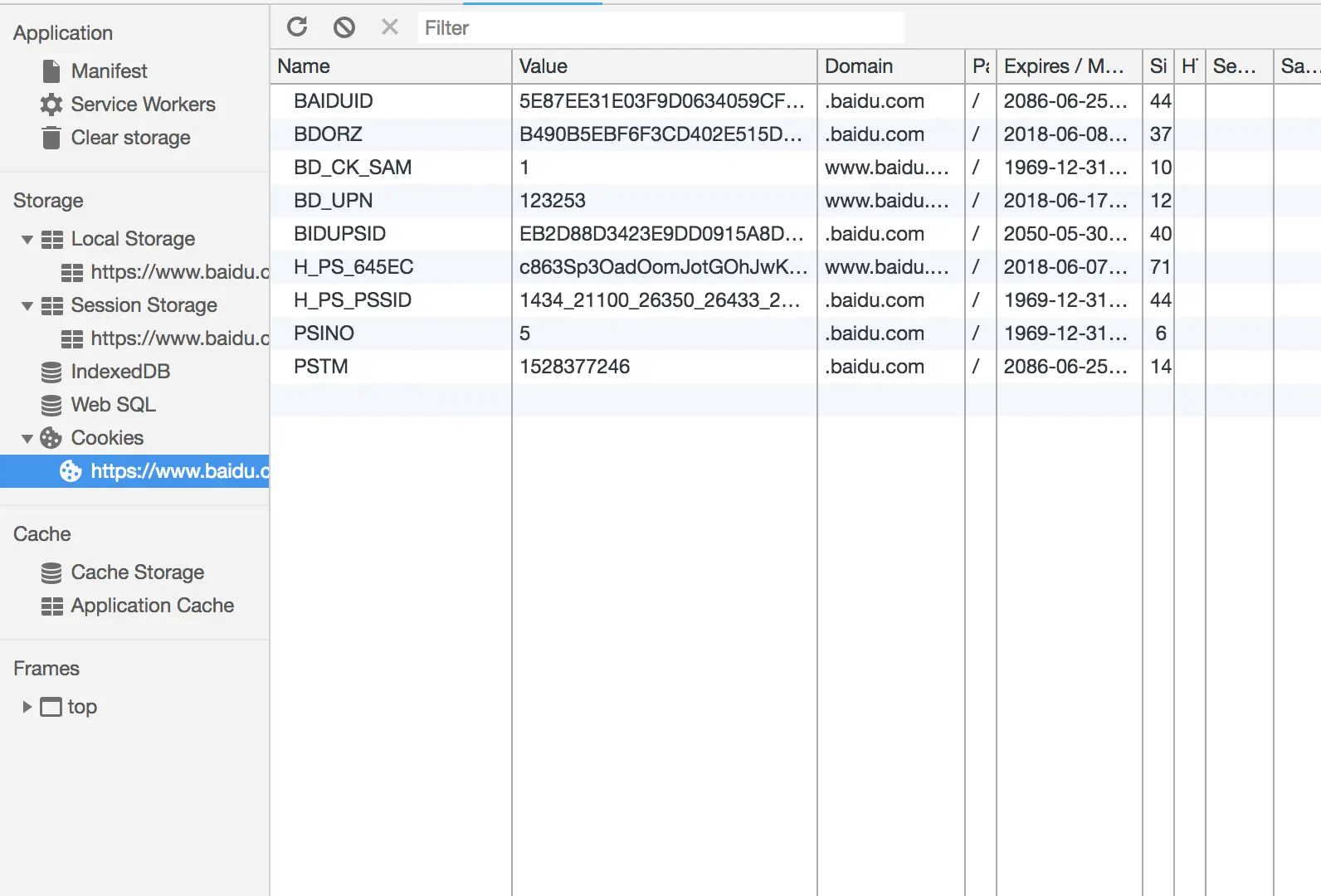 - domain:cookie对于哪个域名下是有效的。所有向该域发送的请求中都会包含这个cookie信息。这个值可以包含子域(如:m.baidu.com),也可以不包含它(如:.baidu.com,则对于baidu.com的所有子域都有效).