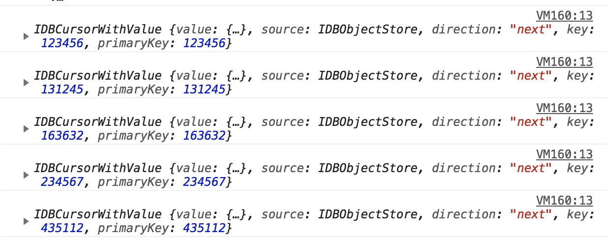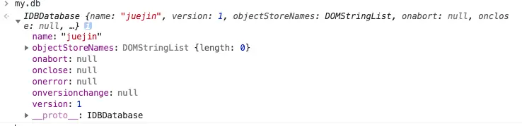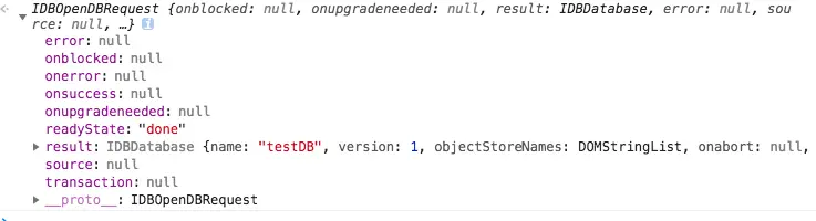 里面有各个状态的回调参数,初始化的时候都是null,需要手动去挂载自定义的回调参数,从而实现window.indexedDB.open函数的状态回调控制,再去控制台Appliation的indexedDB查看