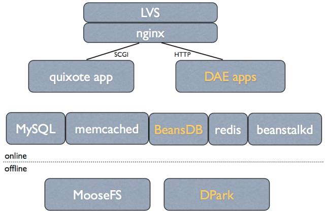 豆瓣整个基础架构可以粗略的分为在线和离线两大块。在线的部分和大部分网站类似:前面用LVS做HA,用Nginx做反向代理,形成负载均衡的 一层;应用层主要是做运算,将运算结果返回给前面的用户,DAE平台是这两年建起来的,现在大部分豆瓣的应用基本都跑在DAE上面了;应用后面的基础服务 也跟其他网站差不多,MySQL、memcached、redis、beanstalkd,不一样的是NoSQL的选择——BeansDB,这是我们在几年前开源的KV数据库,也是国内比较早开源的KV数据库。
