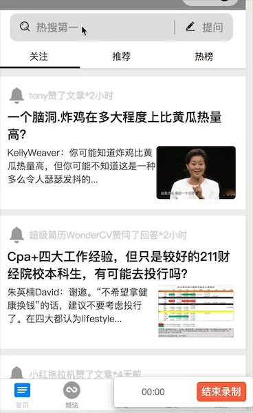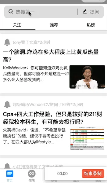 首页由三个tab项组成,”关注”,“推荐”,“热榜”,这几个页面的切换功能分别设置了“点击切换”和“滑屏切换”: