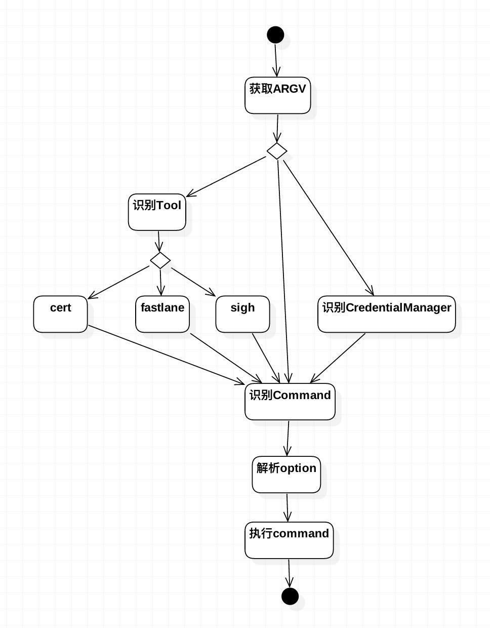 require 'tool_name/commands_generator';如果ARGV.first等于 "fastlane-credentials",则加载require 'credentials_manager';如果都不是,则加载fastlane这个默认的Tool,require "fastlane/commands_generator"。 如果匹配上了Tool之后,删除ARGV.first。 例一:使用默认Tool:fastlane,ARGV = [ "lane_name"]例二:使用Tool:cert,ARGV = ["--username", "your_username", "--development", "false"] -