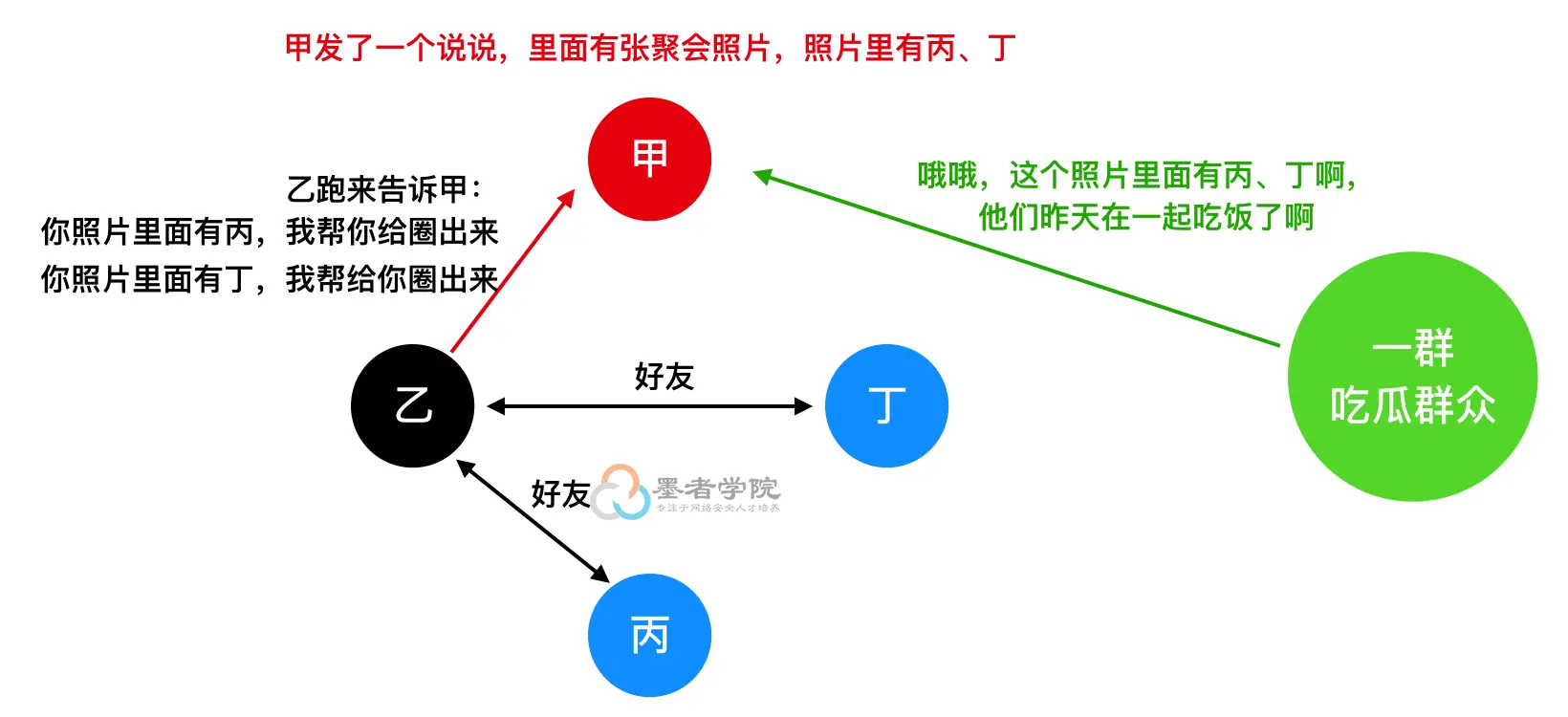 在2013年,QQ空间也推出了圈人功能,在他人对空间说说中,找到要圈人的照片,圈出照片中的好友,从中选择自己相对应的好友就可以。这个其实是个不错的功能,借助他人可以了解到更多信息。拿个简单的图表示下: