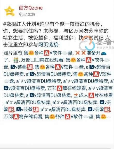2018年6月8日,QQ空间官方账号发布“微视”小电影广告,正文部分是正常的腾讯微视广告,推荐了微视的“红人计划”。然而问题在于,这条动态下方被恶意圈出的人名单,附带了大量名称不可描述的链接。