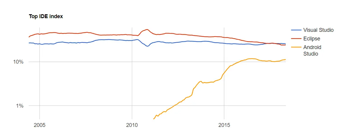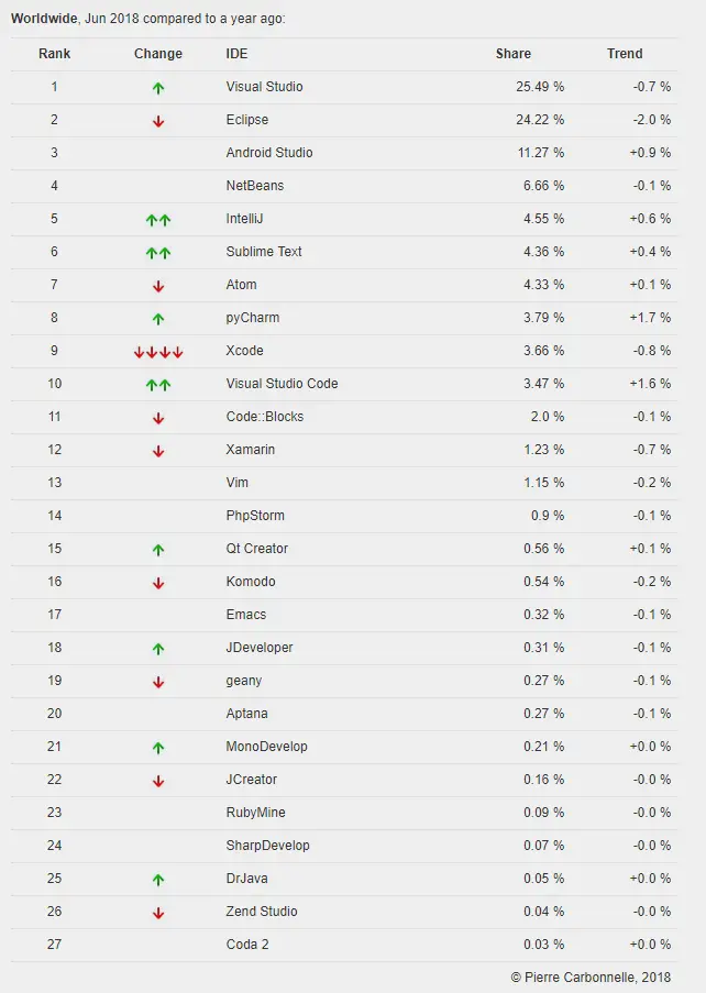 PYPL 6月IDE最新榜单新鲜出炉,本月前三名依然Visual Studio、Eclipse 和 Android Studio,排名变化比较大的都集中在第五到第十名。本月值得关注的是,Xcode在连续4个月下跌的情况下,首次被PyCharm反超。IntelliJ 也成功反超Sublime Text。下图是IDE排名走势图。