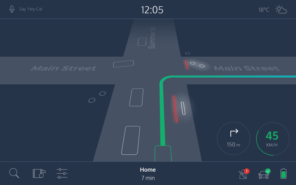 自动驾驶车载交互界面,展示了车主周围所有其他汽车和行人的示意图。在需要特别关注的物体旁边还会出现一条红线,例如骑自行车的人和过马路的人。