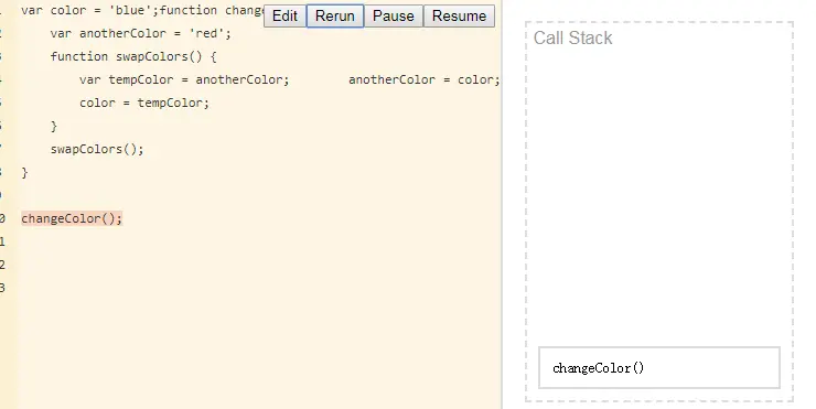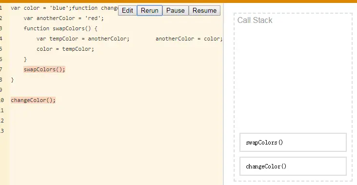 第四步,在swapColors的可执行代码中,没有其他能生成执行上下文的情况,因此这段代码顺利结束自己,他会从call stack中弹出。