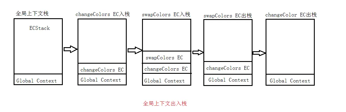 第三步,changeColorsEC的上下文入栈后,开始执行可执行的代码,当遇到swapColors()这句代码时激活了swapColors的执行上下文。因此第三步就是changeColorsEC的上下文入栈。如下图所示: